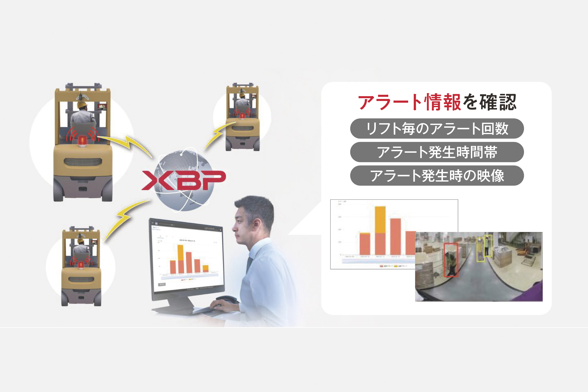 フォークリフトに後付けしたAIカメラで人を検知し、接触事故リスクをアラートと映像で見える化するサービスです。